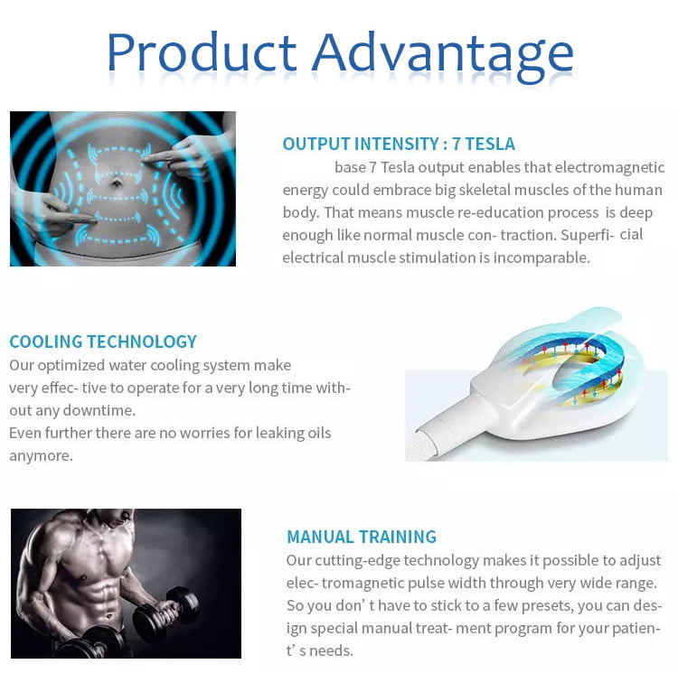 Using High Energy Focused Electromagnetic Wave) technology to continuously expand and contract autologous muscles and carry out extreme training to deeply reshape the internal structure of the muscle,that is, the growth of muscle fibrils (muscle enlargement) and produce new protein chains and muscle fibers (muscle hyperplasia), so as to train and increase muscle density and volume. The 100% extreme muscle contraction of High Energy Focused Electromagnetic Wave technology can trigger a large amount of fat decomposition,Fatty acids are broken down from triglycerides and accumulated in fat cells.The concentrations of fatty acids are too high ,causing the fat cells to apoptosis, which is excreted by the body’s normal metabolism within a few weeks. Therefore, slim beauty machine can strengthen and increase muscle, and reduce fat at the same time.