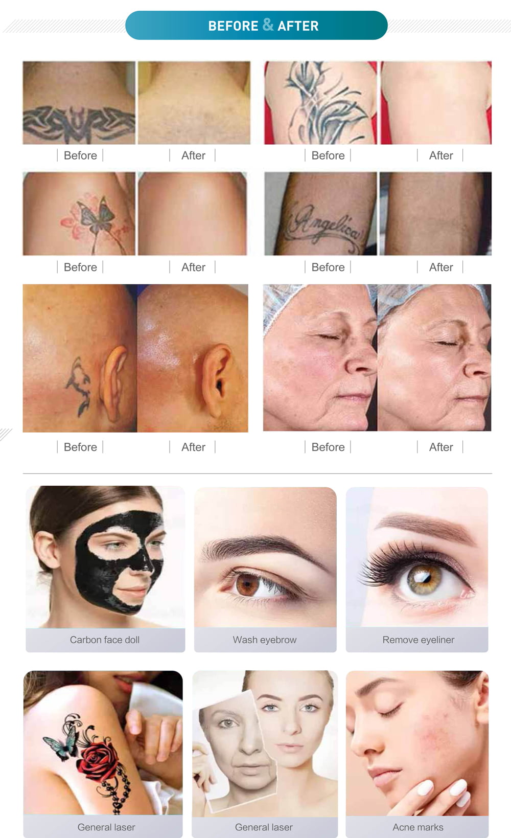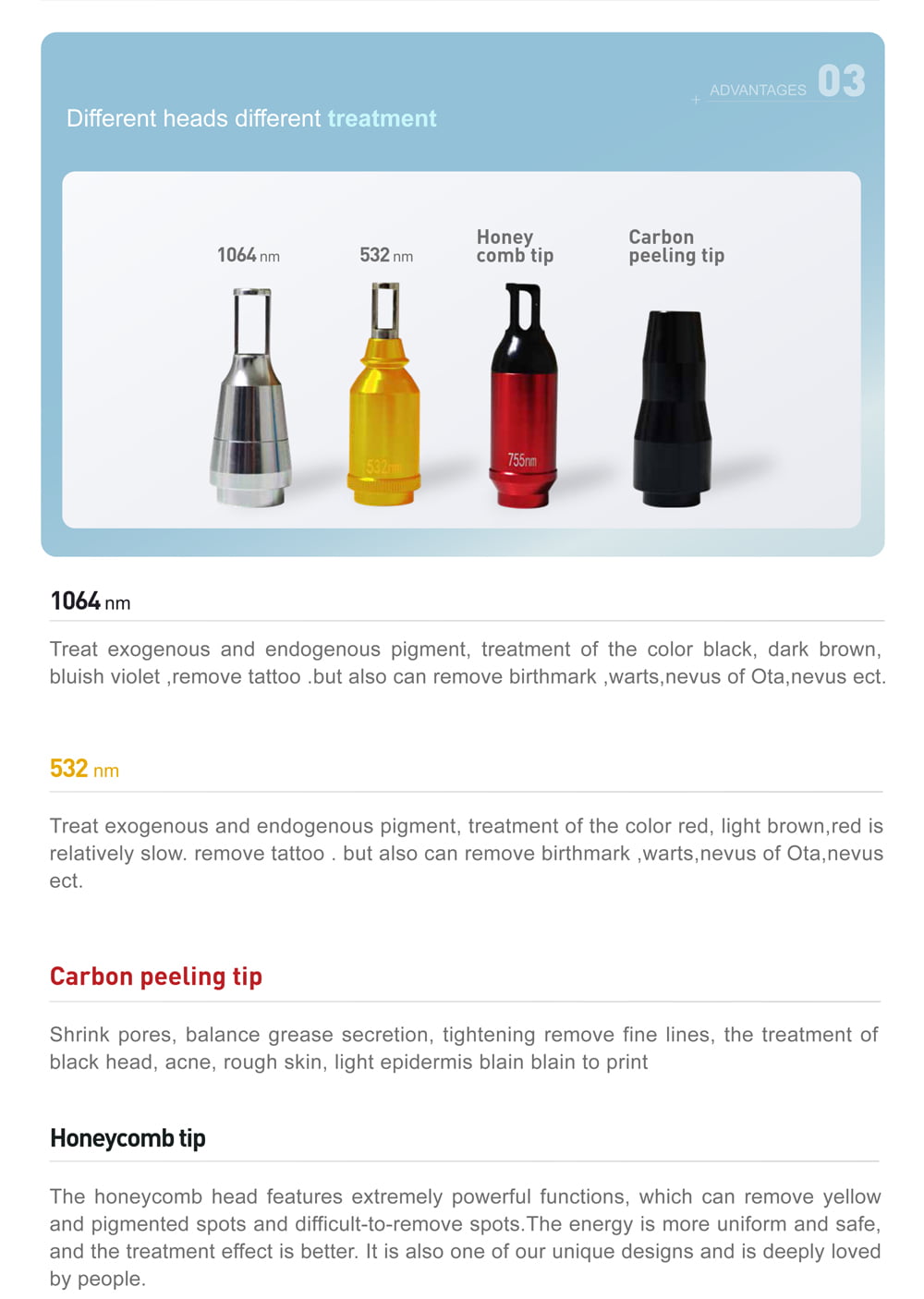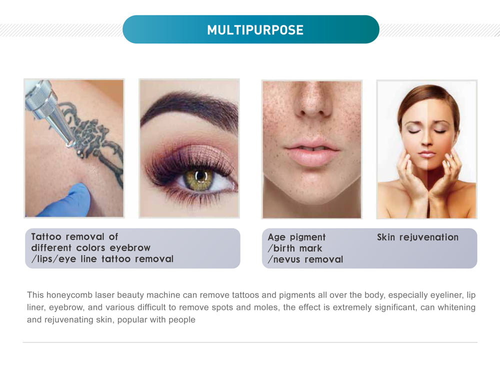 the Q-Switched Nd:YAG 1064 nm laser and the Q-Switched Nd:YAG 532 nm laser wavelengths are absorbed by natural chromophores, like melanin, hemoglobin and water and by exogen pigments like tattoo ink. They are indicated for tattoo removal. The 1064nm is suggested for dark blue and black ink and the 532nm is suggested for red, orange, yellow, and purple ink.