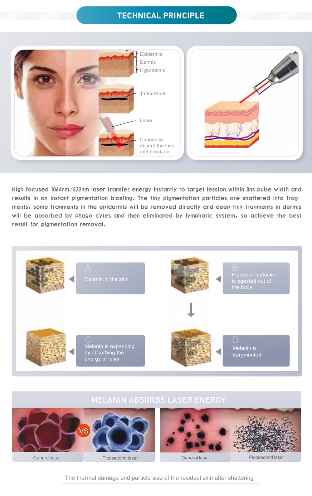 Q-switching Laser is a technique by which a Laser machine delivers very short pulses at very high peak power (hundreds of Mega W) granting the most efficient photoacoustic effect, with no thermal interaction with tissues. As a result, the unwanted pigments of the skin are fragmented in small particles that are expelled through phagocytosis.