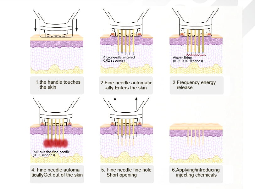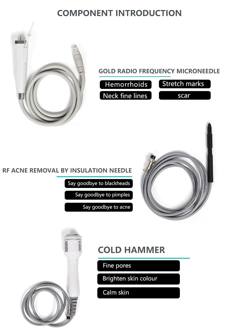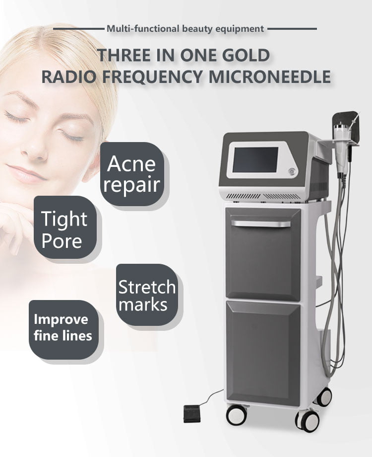 The gold radiofrequency microneedle machine is the ingenious combination of microneedle and radiofrequency. The two words “gold” originate from the microcrystalline gold coating and the coating is also golden yellow. At the time of treatment, the doctor according to the crystal position on Problems and treatment, adjust the depth of penetration and microcrystalline radiofrequency energy, then in the electronic control system, at the same time, dozens of insulating ceramics penetrate the skin quickly, from the microcrystal tip radiofrequency energy, then quickly exit, so the cycle until the treatment is finished, finally apply cosmetic ingredients.